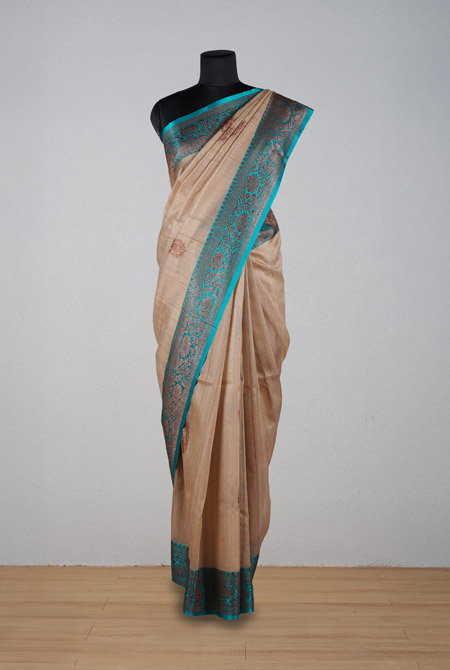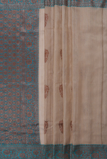 Beige with teal blue border banarasi tussar silk saree