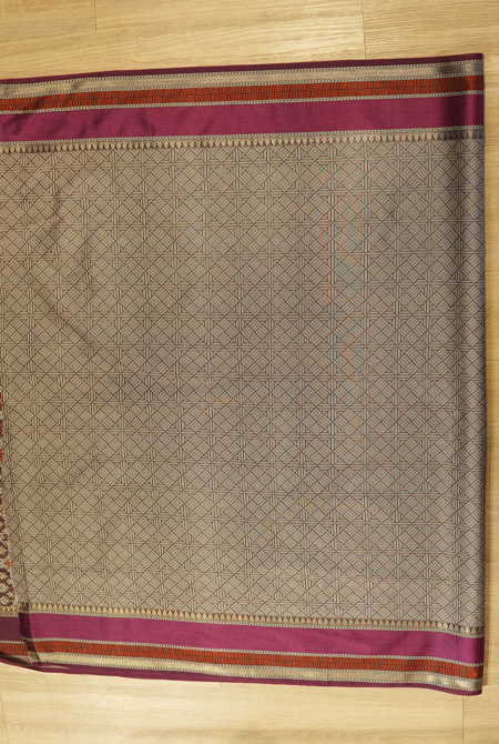 An elegant brown Cotton Banarasi Saree with intricate woven motifs and a contrasting magenta resham work border. Lightweight, timeless, and perfect for festive elegance.