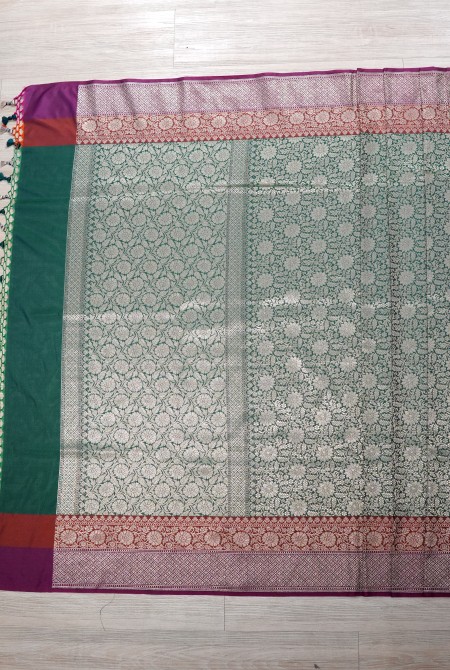 Elegant Banarasi brocade saree in dark green and wine, featuring intricate light gold zari work and a vibrant contrast pallu and border with tassel detailing perfect for festive occasions.