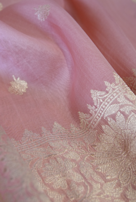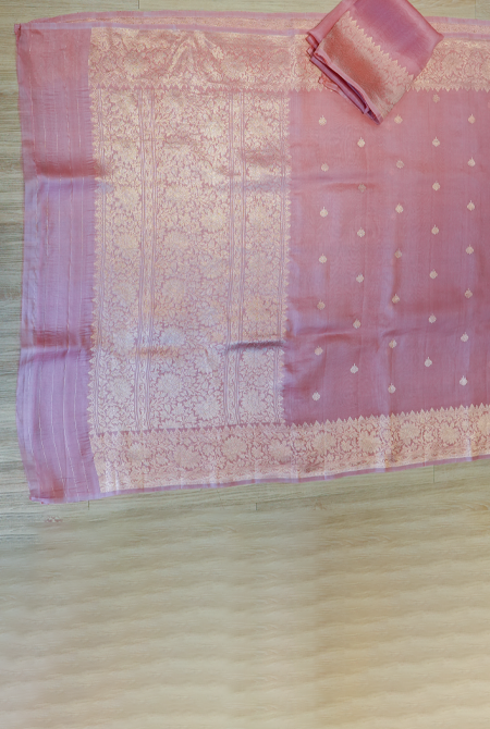 This is a dark peach-colored organza saree with delicate light golden zari embroidery. The saree features small floral motifs scattered across the fabric and a rich, intricately woven golden border with traditional floral patterns, adding elegance and charm.