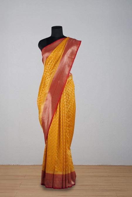 This is yellow saree with intricate golden zari motifs and a contrasting Red border. The pallu is richly decorated with traditional patterns.