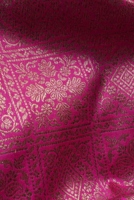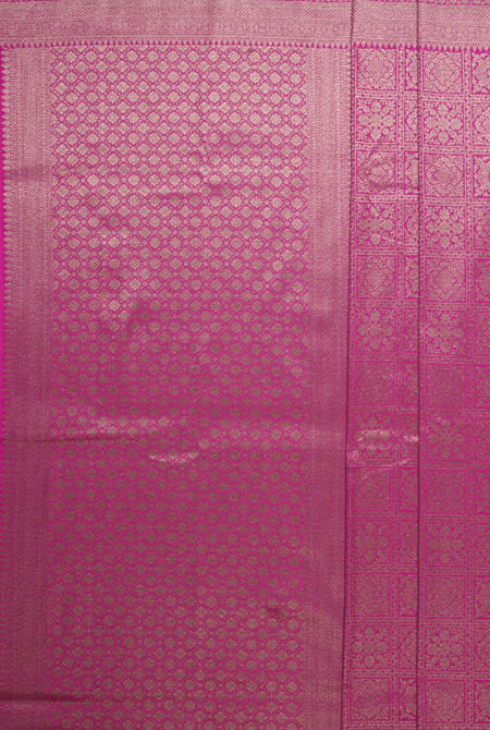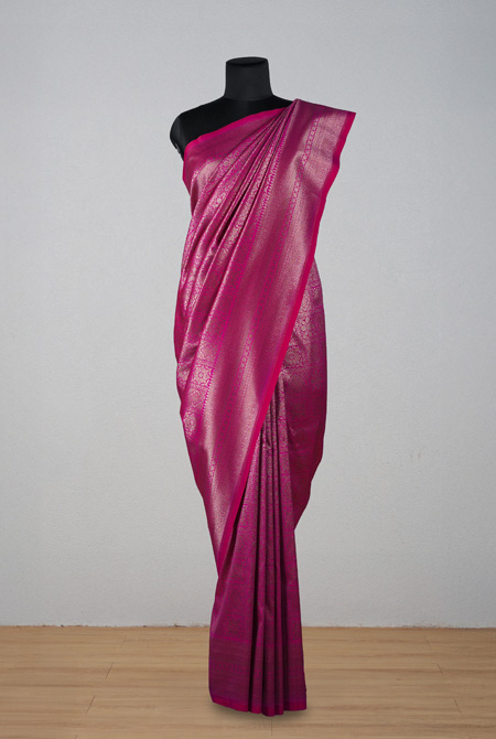 A rich magenta pink color, beautifully complemented with elegant copper zari work along the border. The pink shade gives it a vibrant and festive look — perfect for weddings, traditional functions, or celebrations!