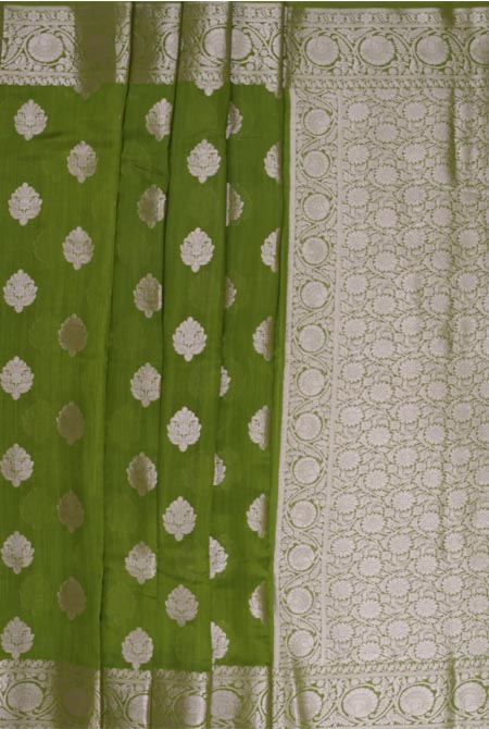 This is a Mahendi base with antique zari floral motifs and an intricate antique zari border, creating an elegant and festive look. Perfect for weddings or celebrations.