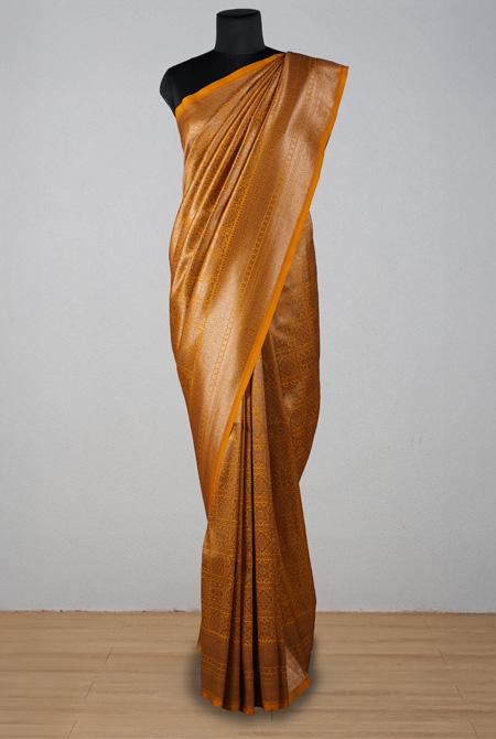This is a beautiful mustard yellow saree featuring intricate copper zari work. The fabric showcases a rich, traditional design patterns woven throughout, giving it an elegant and festive look — perfect for weddings, celebrations, or formal occasions. The fine detailing in the zari highlights skilled craftsmanship and adds a regal charm to the saree.