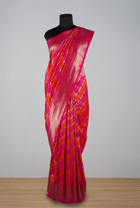 Elegant Orange & pink soft silk saree with golden zari stripes on the pallu and subtle geometric patterns on the body—perfect for festive and formal occasions.