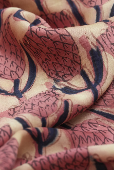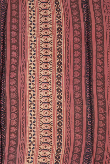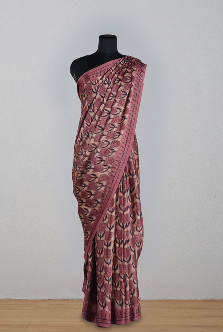 Peach saree with block-printed motifs of stylized leaves, berries, and geometric patterns in grey and brown.