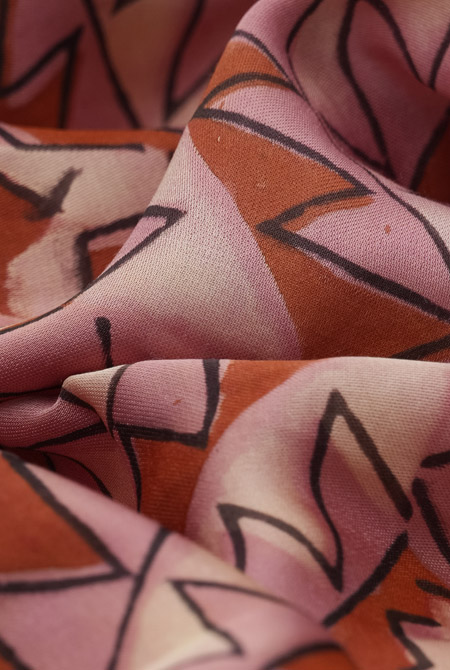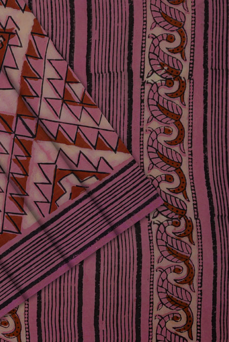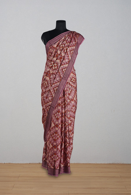 This saree features a peach base with intricate geometric and linear block prints in earthy tones. It combines sharp zigzag patterns with detailed vine motifs, offering a blend of traditional and contemporary aesthetics.