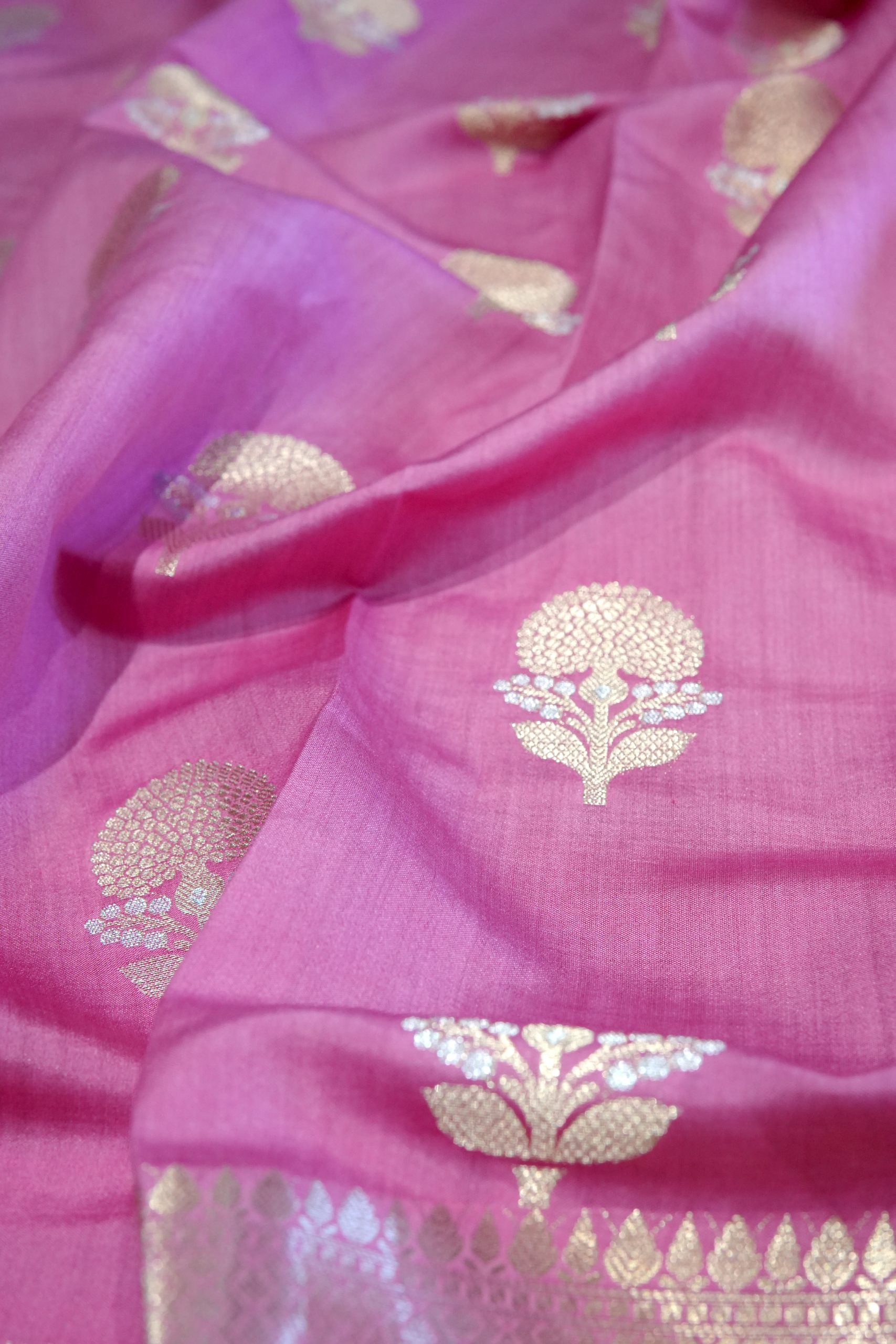 This saree is a pink color, beautifully accented with water zari floral motifs and a rich water zari border featuring intricate traditional patterns. The floral motifs have touches of light blue detailing, adding a subtle contrast. Perfect for festive occasions, weddings, and celebrations, this saree blends vibrancy with elegance.