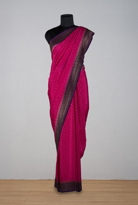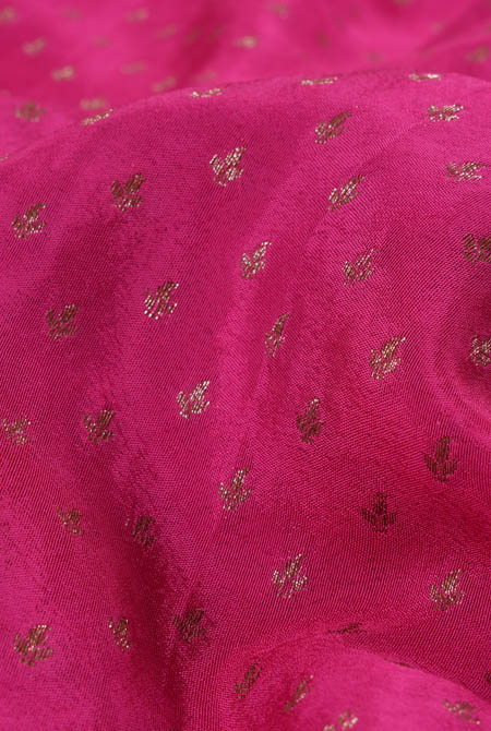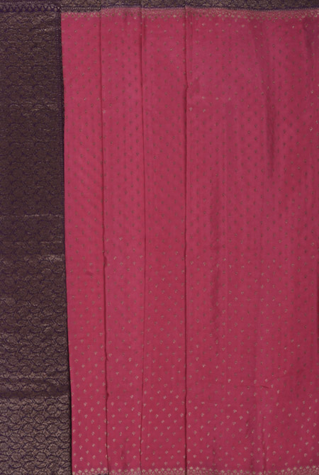 This is a stunning Pink Banarasi silk saree featuring delicate golden zari motifs scattered throughout the fabric. The rich contrast border and pallu, woven in elegant purple and gold patterns, add a vibrant yet graceful touch — making it perfect for festive celebrations and special occasions.