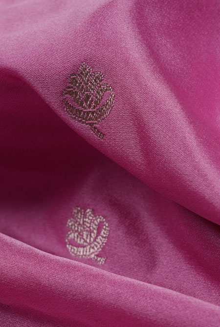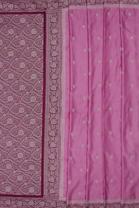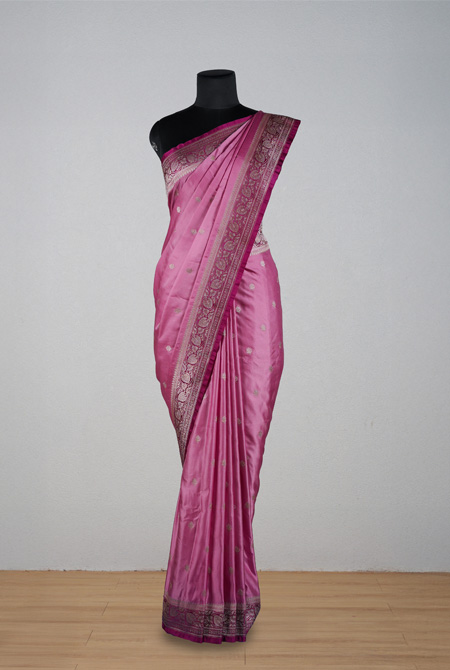 This elegant Mashru silk Banarasi saree in soft pink features rich magenta borders and pallu adorned with intricate gold zari work, complemented by delicate motifs scattered across the body.