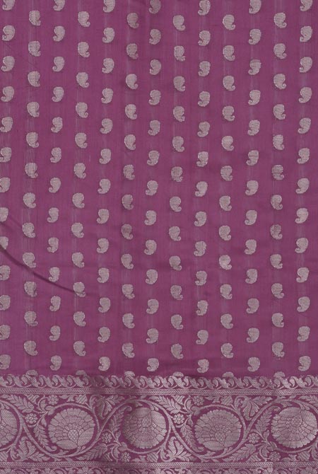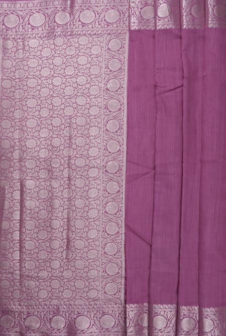 This is a beautiful Purple moonga silk saree featuring an elegant antique zari border with intricate floral and circular motifs. The rich texture and classic design make it perfect for festive occasions and traditional celebrations.