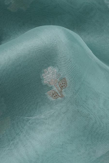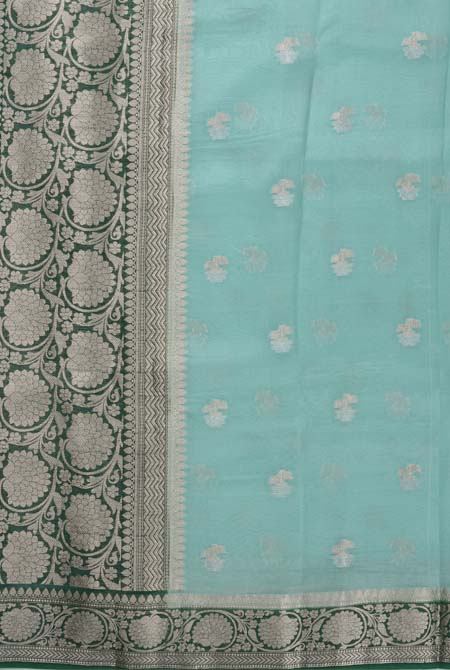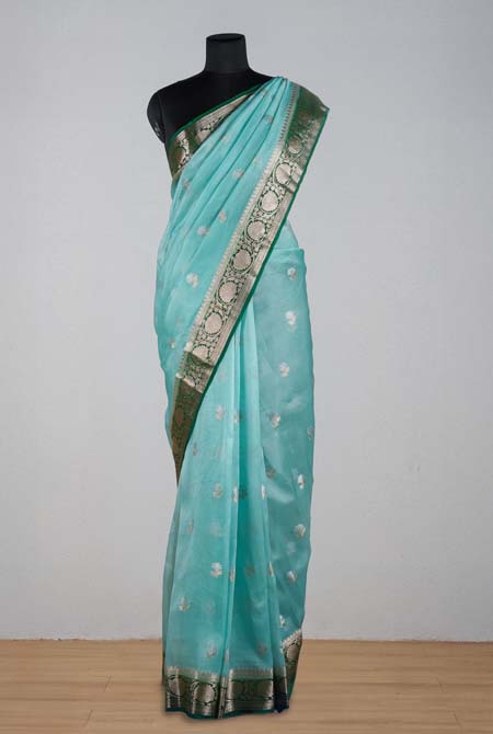 This is a sea green organza saree with intricate golden zari motifs and a richly woven floral zari border on a dark green base, perfect for festive and traditional occasions.